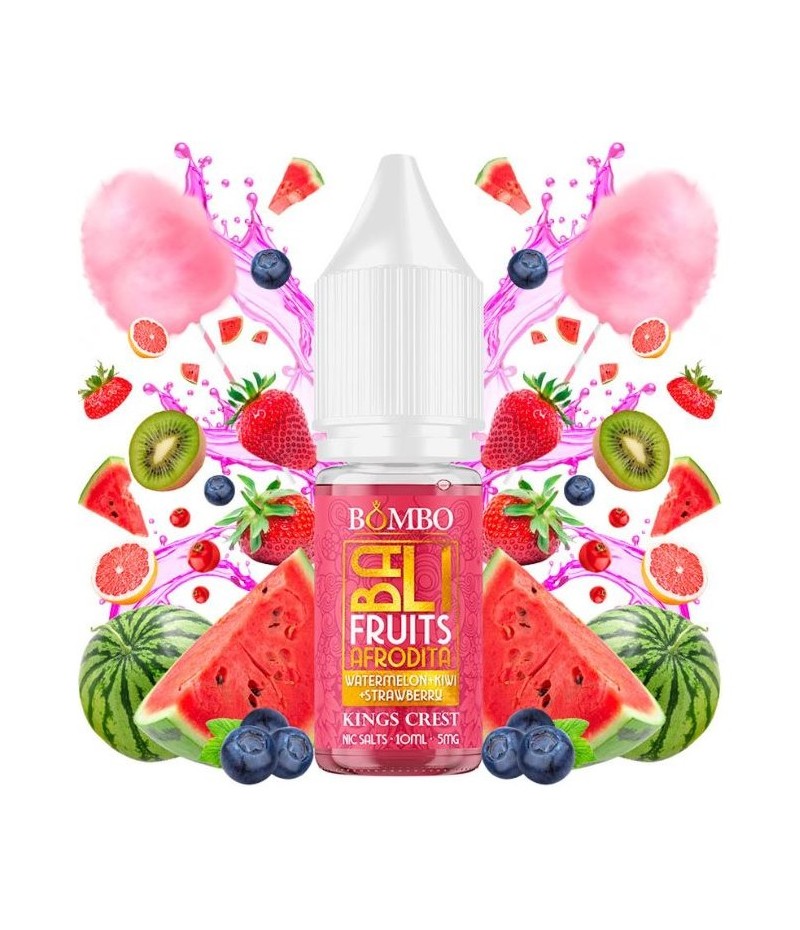 El líquido Watermelon + Kiwi + Strawberry + Afrodita de Bali Fruits by Kings Crest & Bombo ofrece una sedosa explosión frutal de sandía, kiwi y fresa envuelta en algodon de azúcar, mezclada magistralmente con sirope de grosella y aromas secretos.