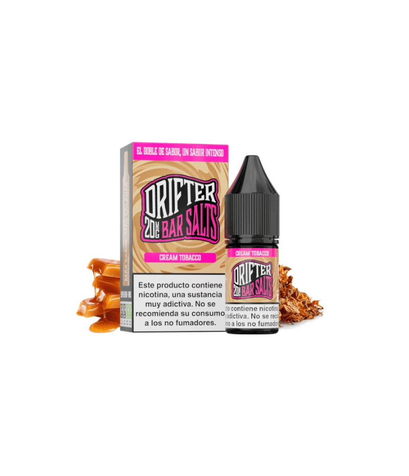 Drifter Bar Salts Cream Tobacco. Experimenta la suavidad del tabaco combinada con una nota de caramelo, creando una experiencia de vapeo sofisticada y satisfactoria.