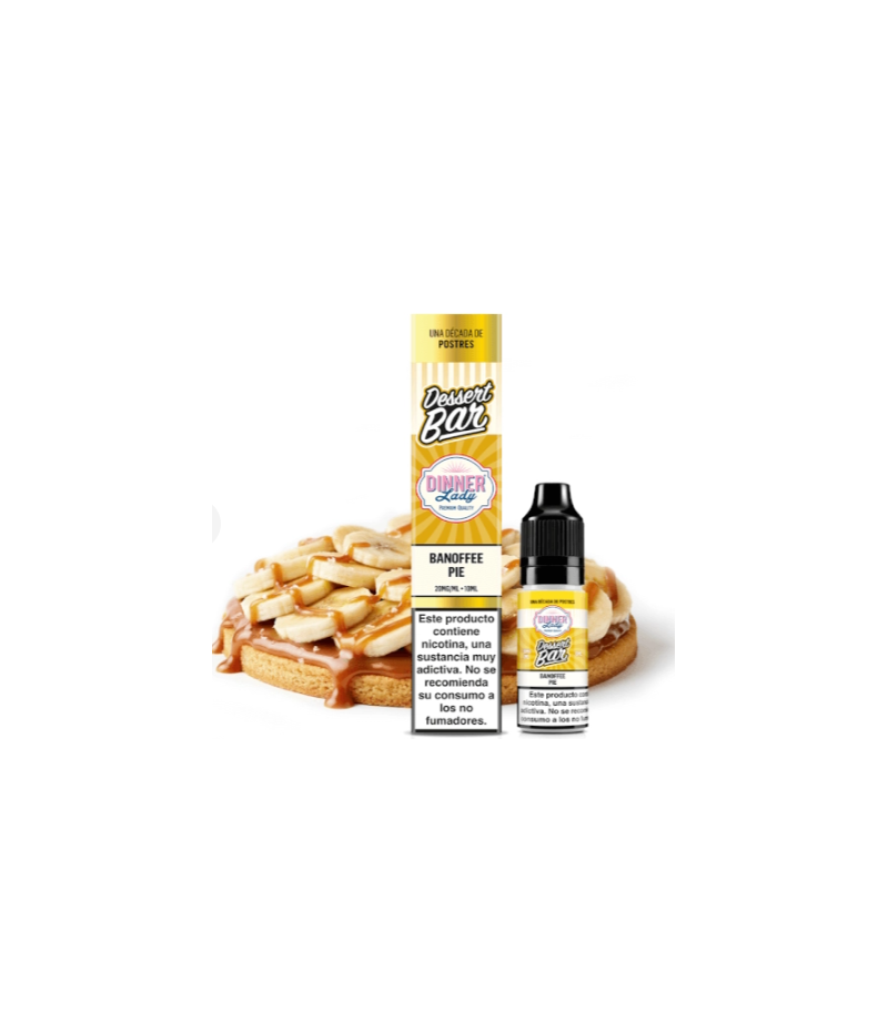 Dinner Lady Salts Dessert Bar Banofee Pie 10ml es un e-liquid premium que recrea la clásica tarta Banoffee con una mezcla cremosa y pegajosa de plátano dulce, toffee y caramelo salado sobre una base de galleta mantecosa.
